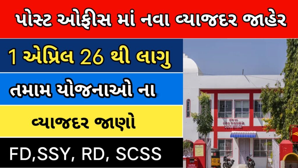 Last Update 1 April 2026પોસ્ટ ઓફિસની તમામ સ્કીમોનો વ્યાજદર વિશે સરકારે જાહેરાત કરી દીધી છે આજે આપડે પોસ્ટ ઓફિસની તમામ સ્કીમોના વ્યાજ દર વિશે જાણીશું આ વ્યાજદર 1 એપ્રિલ 2026 થી ત્રણ મહિના (30 જૂન) સુધી લાગુ થશે.